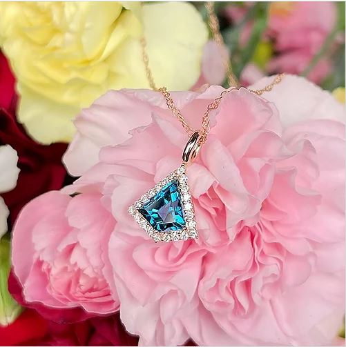 Fun geometric Rose Gold London Blue Topaz and Diamond Pendant! This pendant hangs on an 18" 14k Rose gold chain. Incredible color Topaz with blindly bright natural Diamonds!