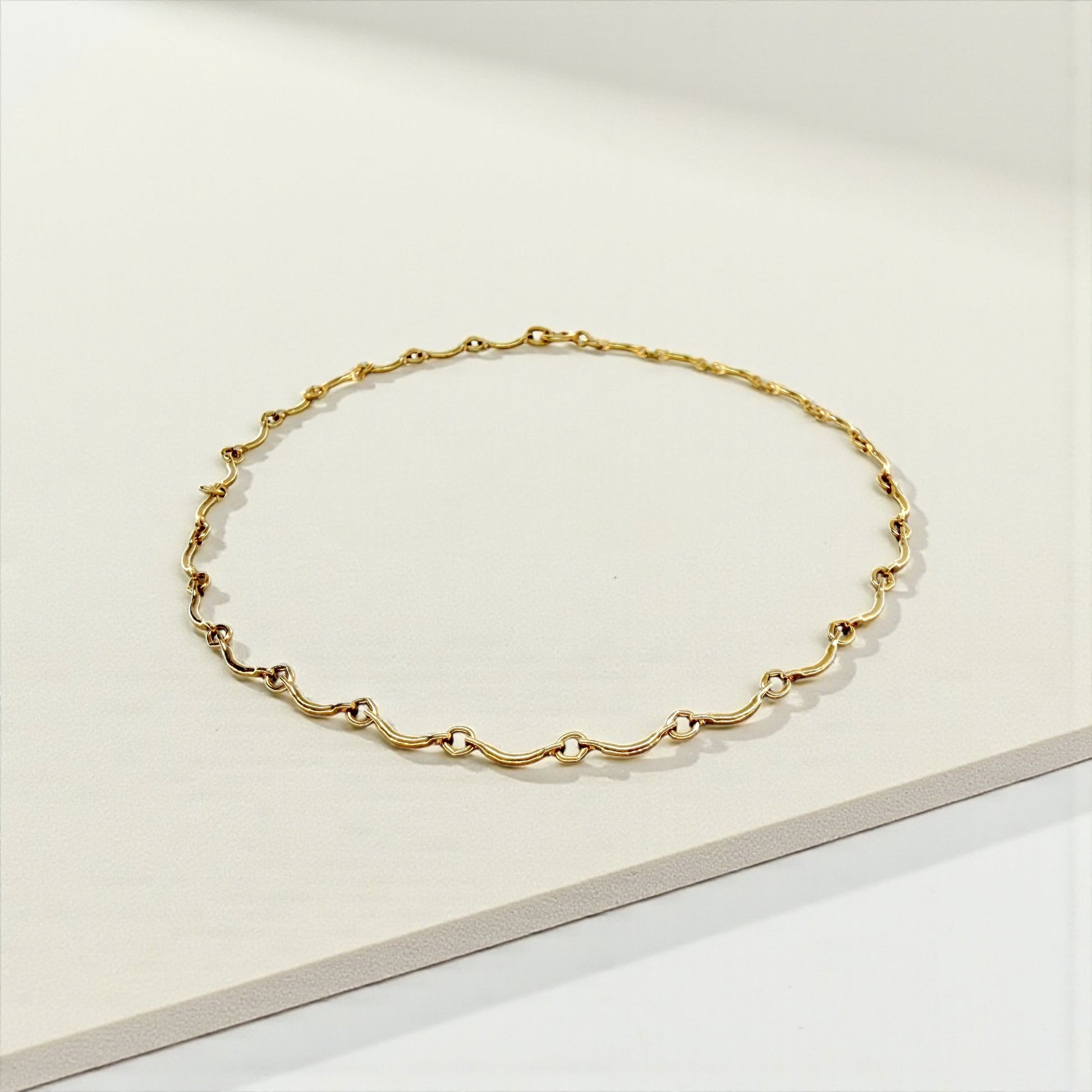 14K anklet with a unique bar and loop style link. 9", 2.02g; delicate but sturdy.