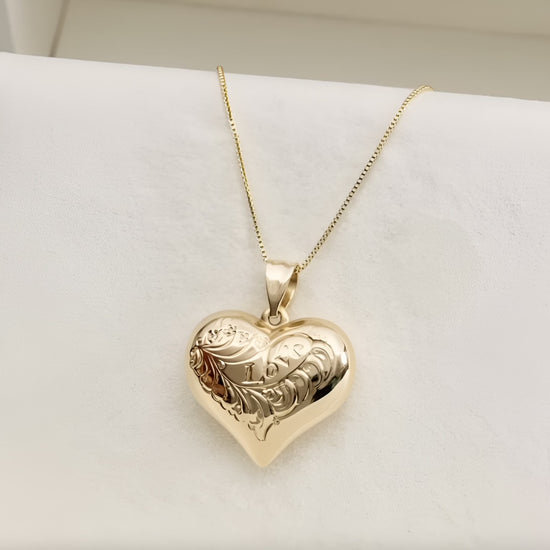 14K hollow heart shaped engraved puff pendant. Gorgeous floral motif, inscribed with "Love" for a gift they (or yourself!) will cherish. Approx. 1" tall. Chain included.