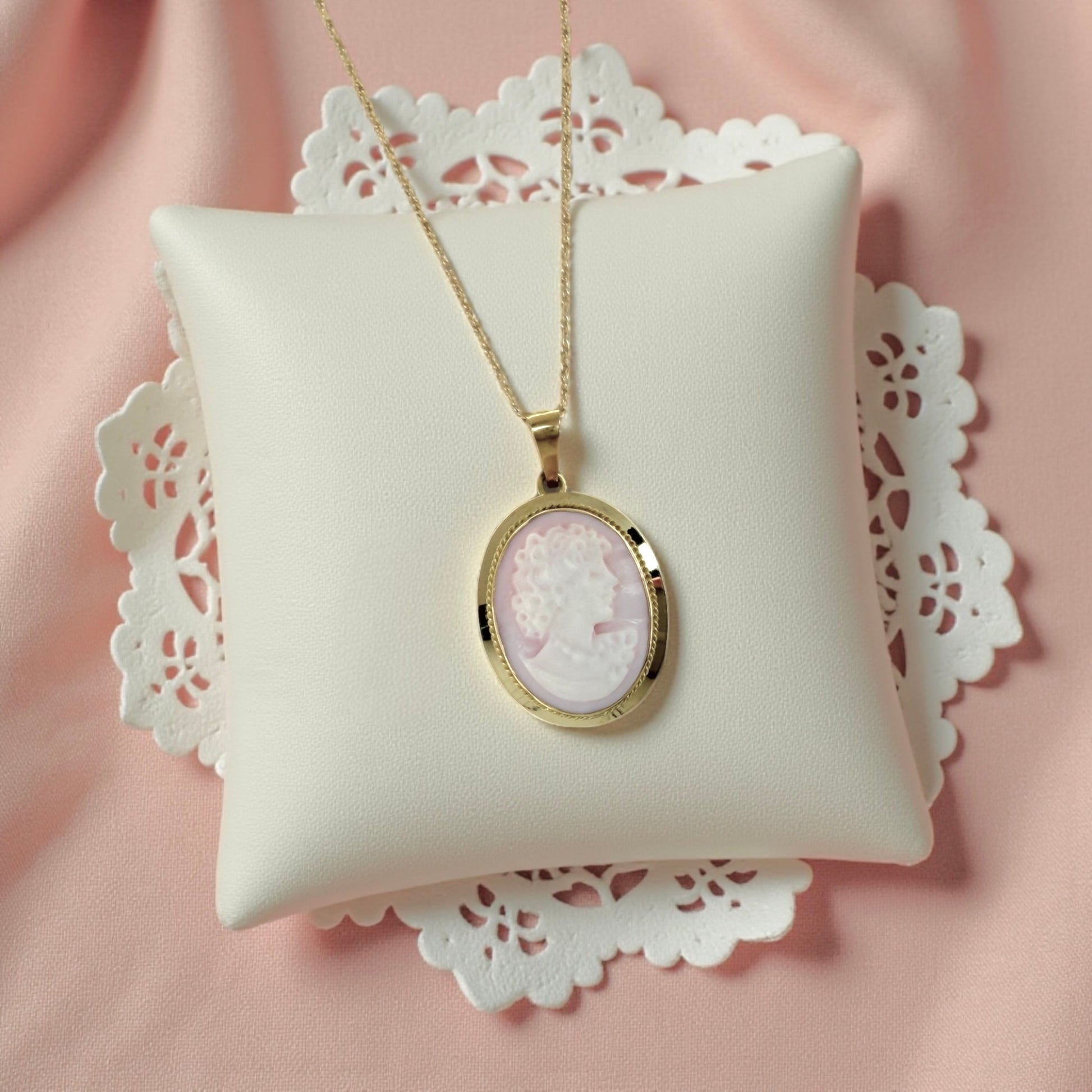 Carved from a soft pink shell, this delicate cameo necklace is a statement that showcases femininity. 18K yellow gold, 18" sturdy chain; this collectable piece is a standout.
