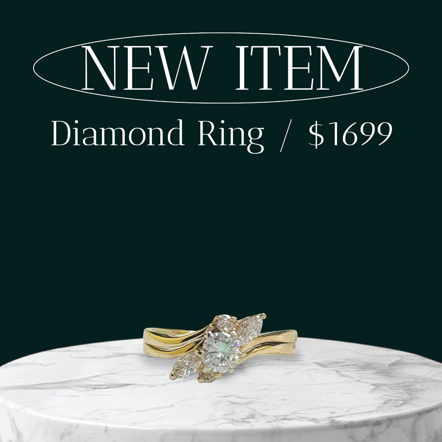 Delicate, feminine, and classic. This timeless 14 karat yellow gold engagement ring is set with 0.25 carat of shimmering diamonds. Decorated with two marquise shaped and two round brilliant cut diamonds, this ring is sure to impress while remaining elegantly simple.