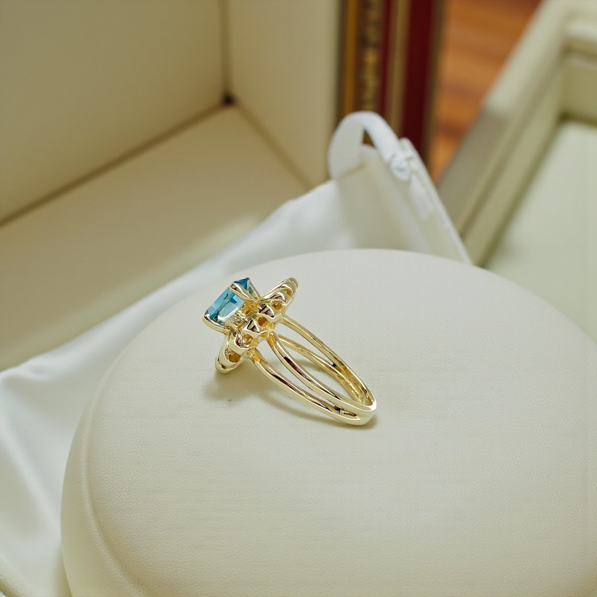 10K yellow gold blue topaz ring with flower petal disc and two accent diamonds. Petite and feminine, perfect gift for a graduation or other special occasion.