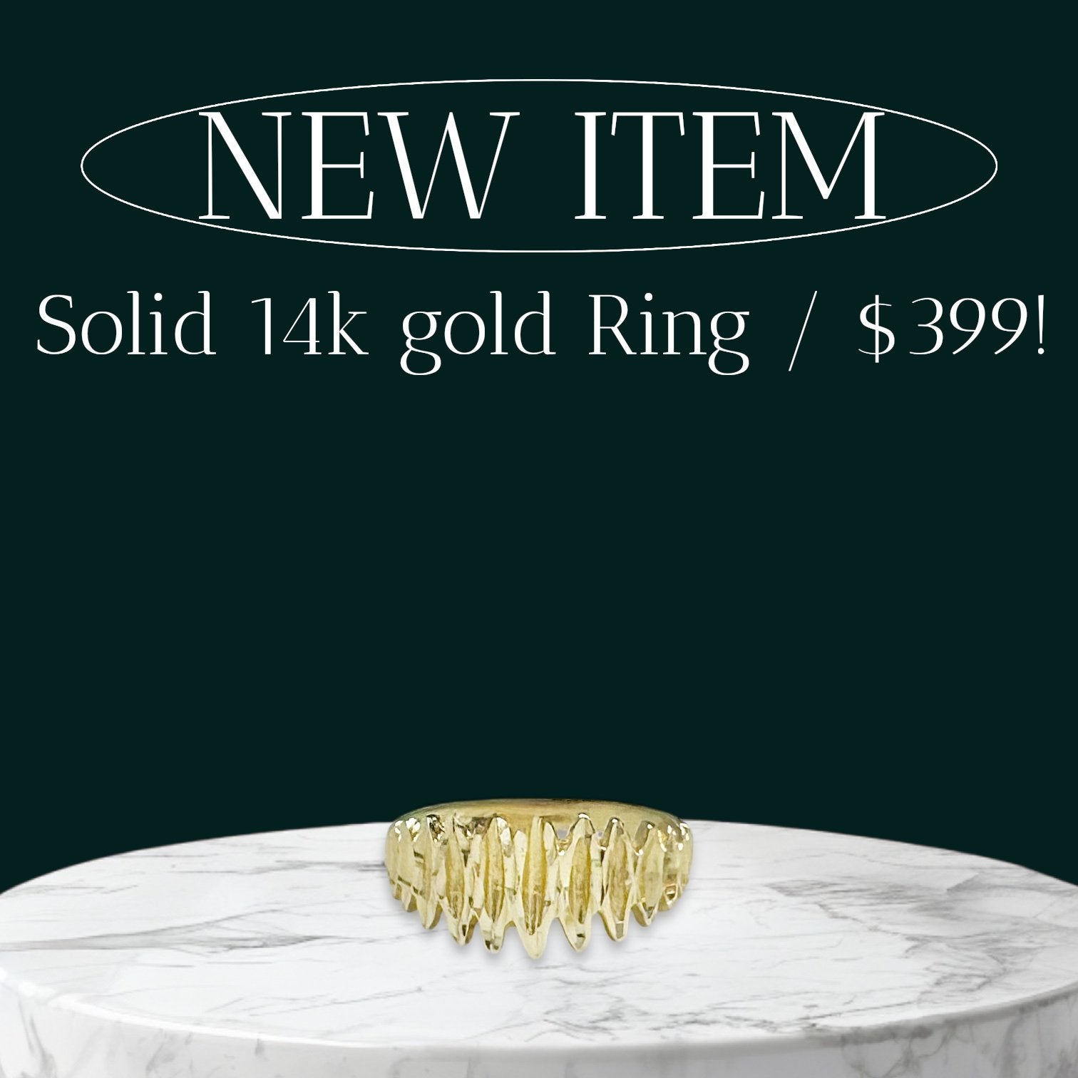Spice up your everyday fashion with this fabulous, intricately carved 14K band. Size 6.75, but as always, your first sizing is free with purchase.